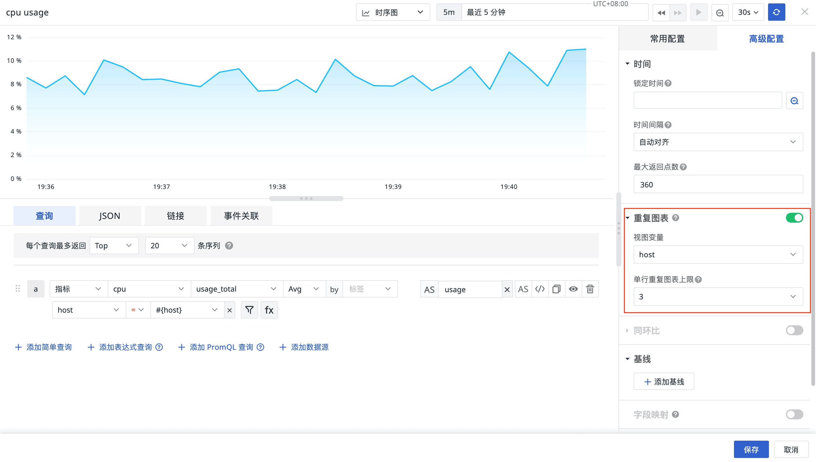 高级配置:新增“重复图表”选项。开启后,系统会根据所选视图变量的各个值,按相同结构生成多张图表;