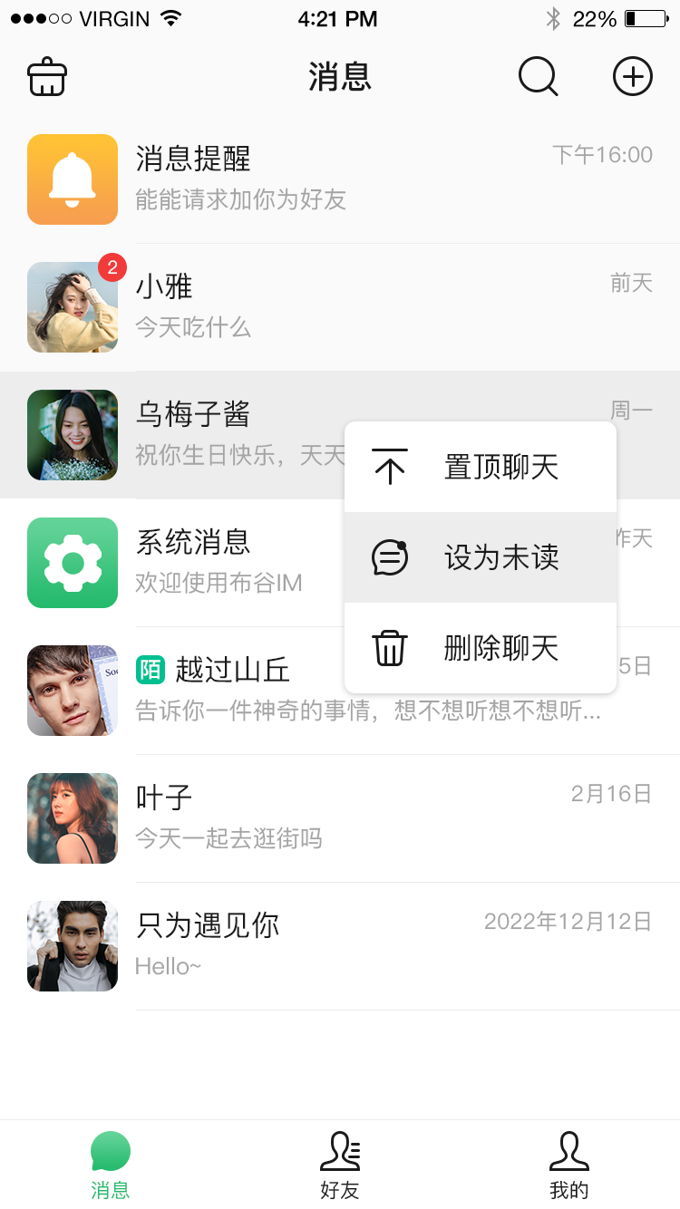 操作:置顶(取消置顶),设为未读,勿扰,删除会话