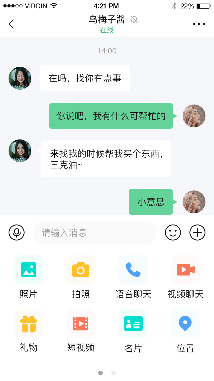 4.聊天内容展示:可展示文字、图片、语音条、视频电话、语音电话、表情、文件等内容