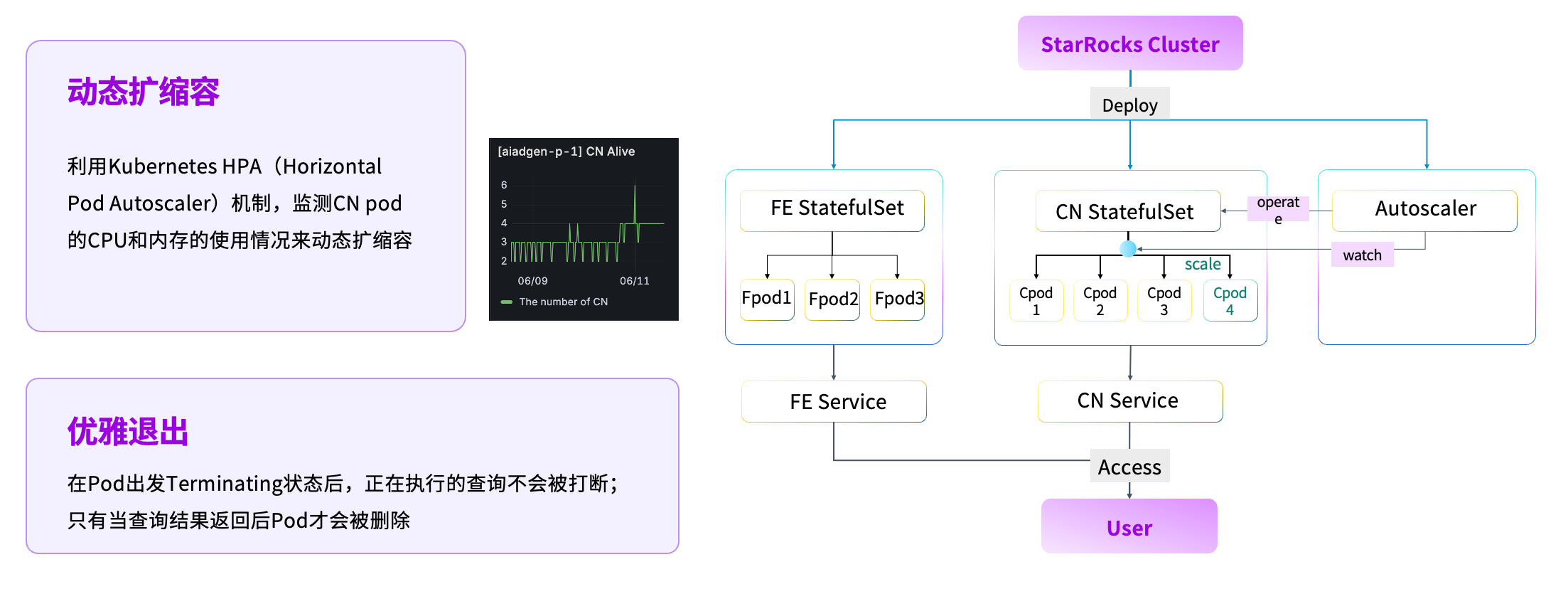 在资源管理层面,我们基于 Kubernetes 完成了自动扩缩容能力建设。当前绝大多数组件均运行在 Kubernetes 环境中,我们通过引入 HPA(Horizontal Pod Autoscaler),动态监测 CN Pod 的 CPU 与内存使用情况,实现计算资源的按需伸缩。当业务负载降低时,系统可自动释放计算资源。同时,为确保正在执行的任务不受影响,平台会在 Pod 退出前检测其状态,仅在 SQL 执行完成后才允许回收资源,实现优雅退出。