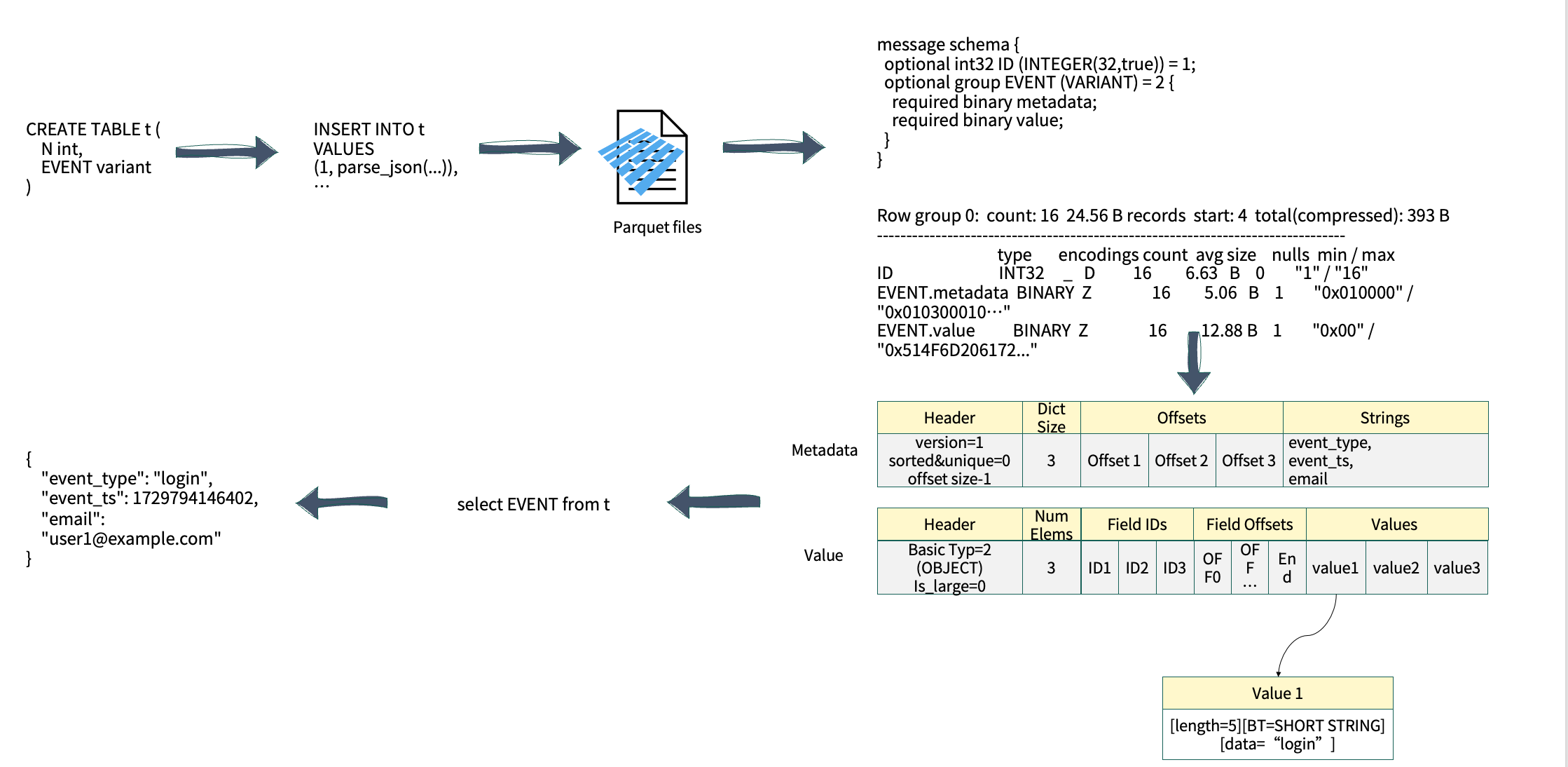 除了基础类型外,Variant 还支持 Object 与 Array 等复杂结构。以实际应用为例,当创建包含 Variant 字段的表并将数据写入 Parquet 文件时,其 Schema 结构会分为两部分(如上图右侧所示):