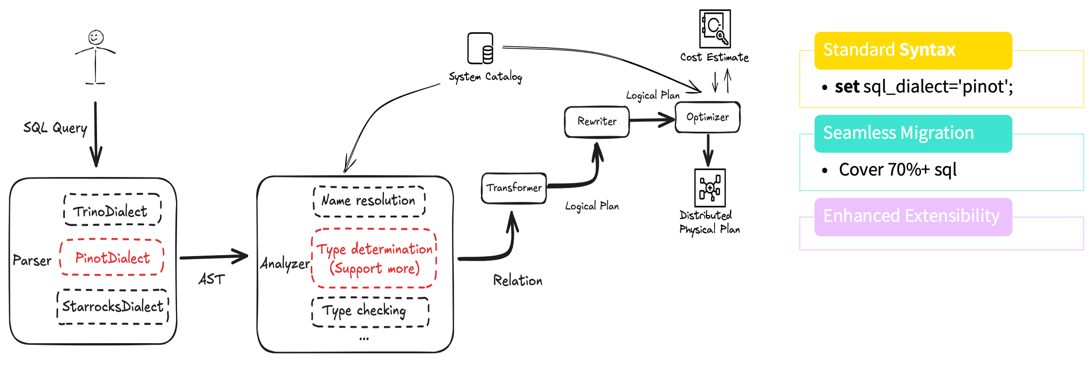 在迁移过程中,我们首先开展的工作是 SQL Dialect Transformer(SQL 方言转换)。如前所述,业务团队通常不希望修改已有 SQL 来适配新引擎。