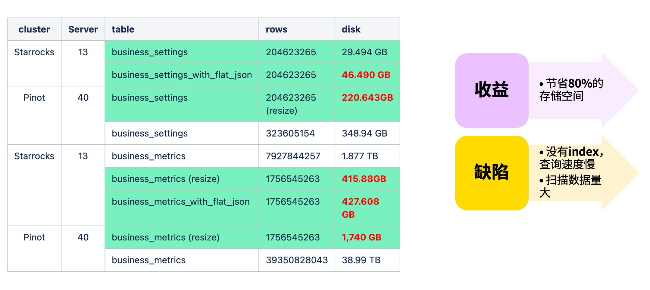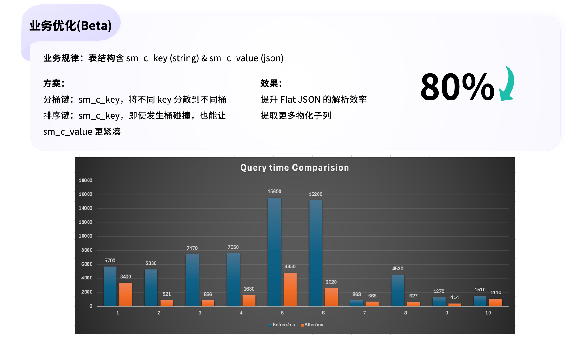 Flat JSON 优化后磁盘占用降低 80%,查询时延减少 80%;