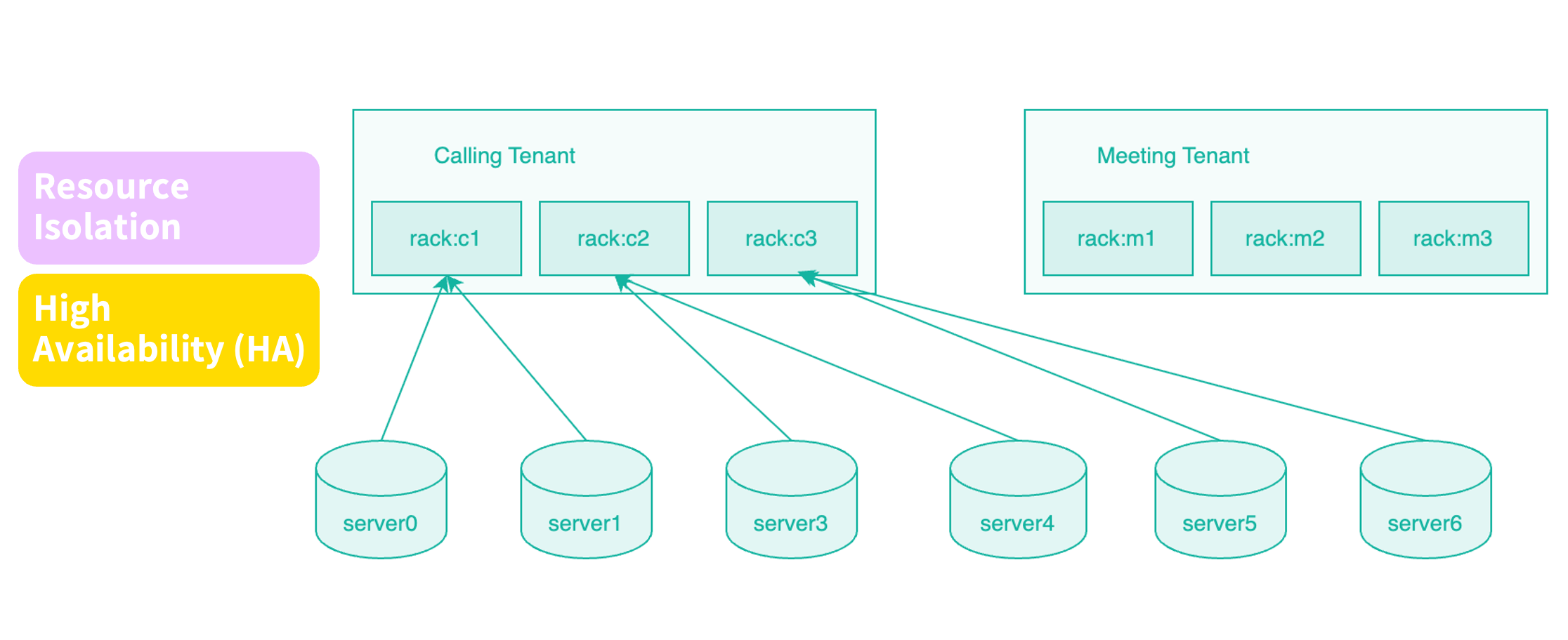 具体做法是:在同一集群中,为不同业务分配不同的机器组。例如,在一套包含 30 台节点的集群中,可将前 10 台用于 Device 服务,中间 10 台用于 Meeting,其余节点用于 Calling。