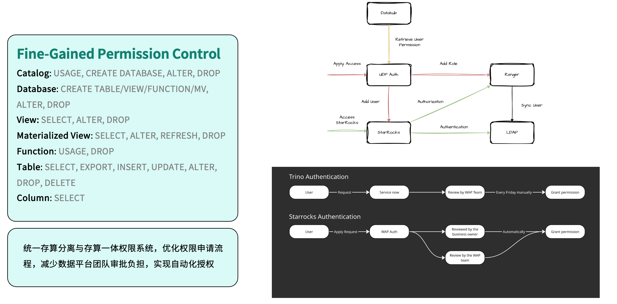 在安全与权限管理方面,我们完成了权限体系的统一整合。系统集成 Apache Ranger 进行规则配置,并通过 LDAP 实现集中身份认证,所有权限最终统一至自研平台 UDP(Unified Data Platform) Auth 进行管理。相比此前基于 Trino 的人工授权流程,如今用户申请权限后即可由业务维护者或系统自动审批,实现了授权的自动化。这不仅提升了安全与合规性,也显著减少了人工操作与运维负担。
