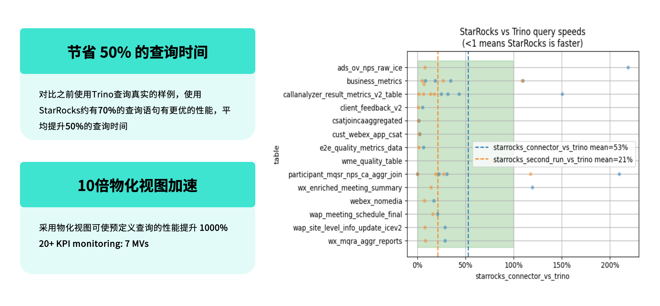 在相同的业务查询场景下,约 70% 的查询语句在 StarRocks 上的性能优于 Trino;