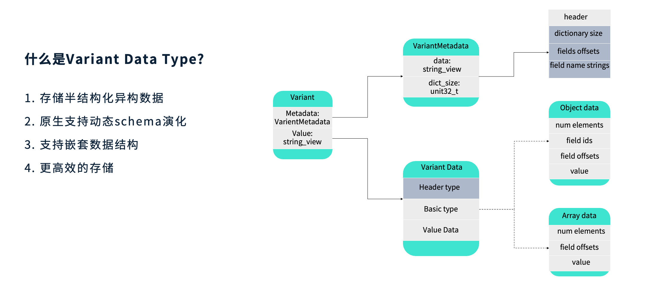 Variant 是一种用于存储动态变化的半结构化数据的数据类型,典型应用场景是查询 JSON。它能够原生支持动态 Schema 演化,并具备对嵌套数据结构的识别与处理能力。由于采用了更高效的编码方式,Variant 在性能与空间利用率之间取得了良好平衡。