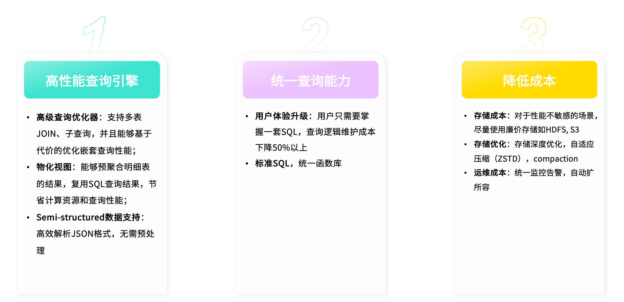 新的引擎需要在性能上具备足够优势,能够支持多表 Join 与子查询等复杂操作,确保查询结果的准确性与响应速度。同时,应支持物化视图以加速常见查询。
