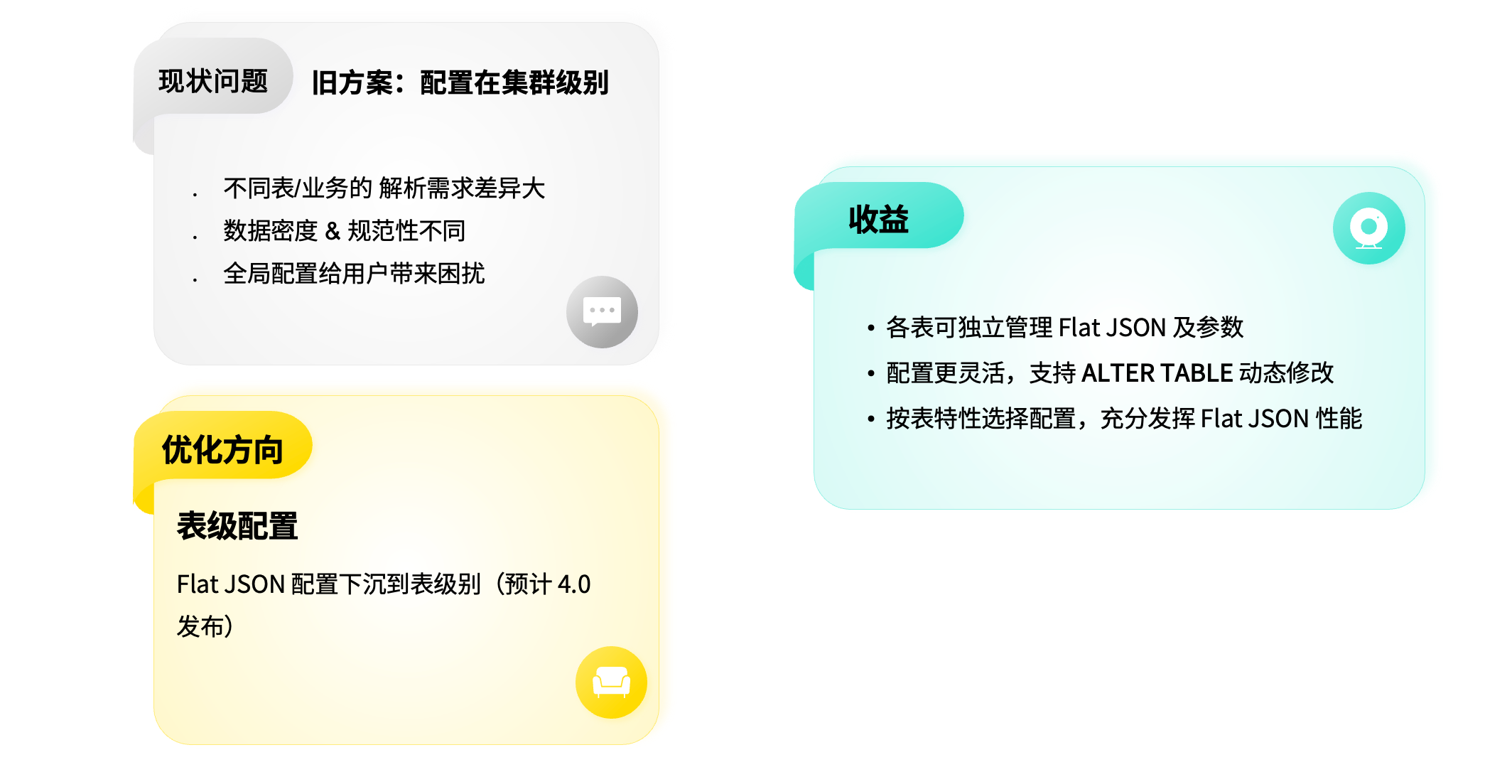 针对这一问题,我们优化了 Flat JSON 的配置机制。原先该功能仅支持集群级别配置,而现在我们将其下沉至表级别:每张表都可根据自身数据结构独立设置 sparsity factor (数据稀疏度)、null factor(空值处理方式)等参数。