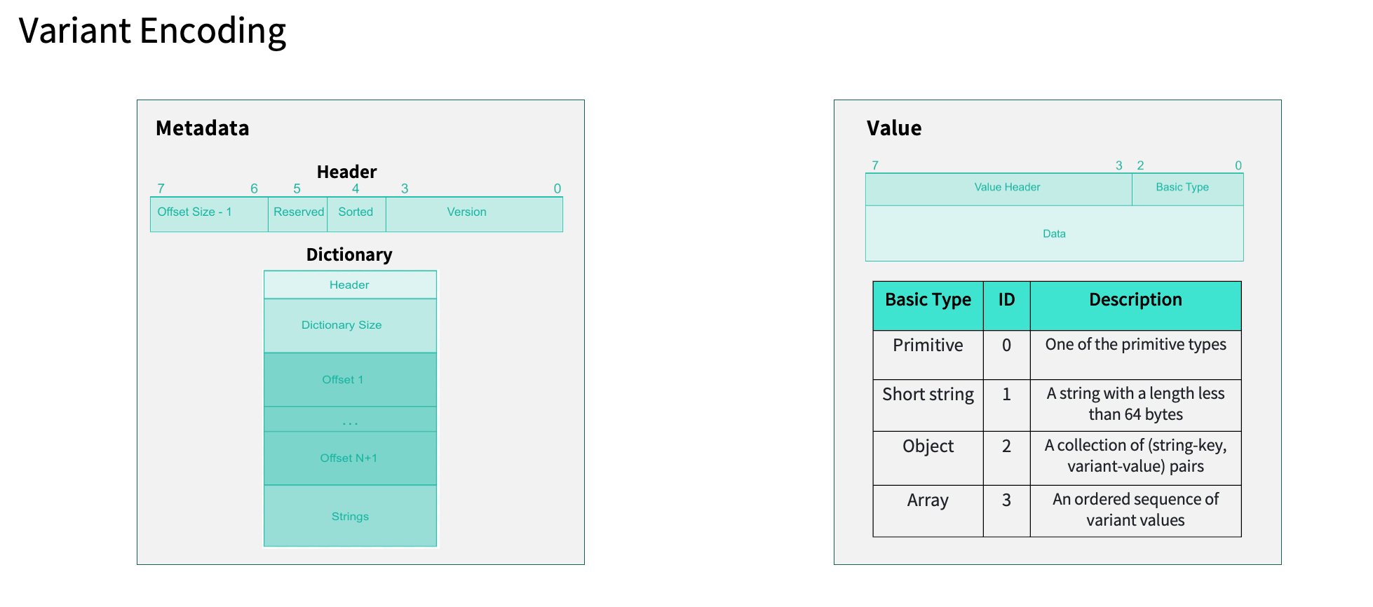 从编码结构上看,Variant 由两部分组成:Metadata(元数据) 与 Value(数据值)。