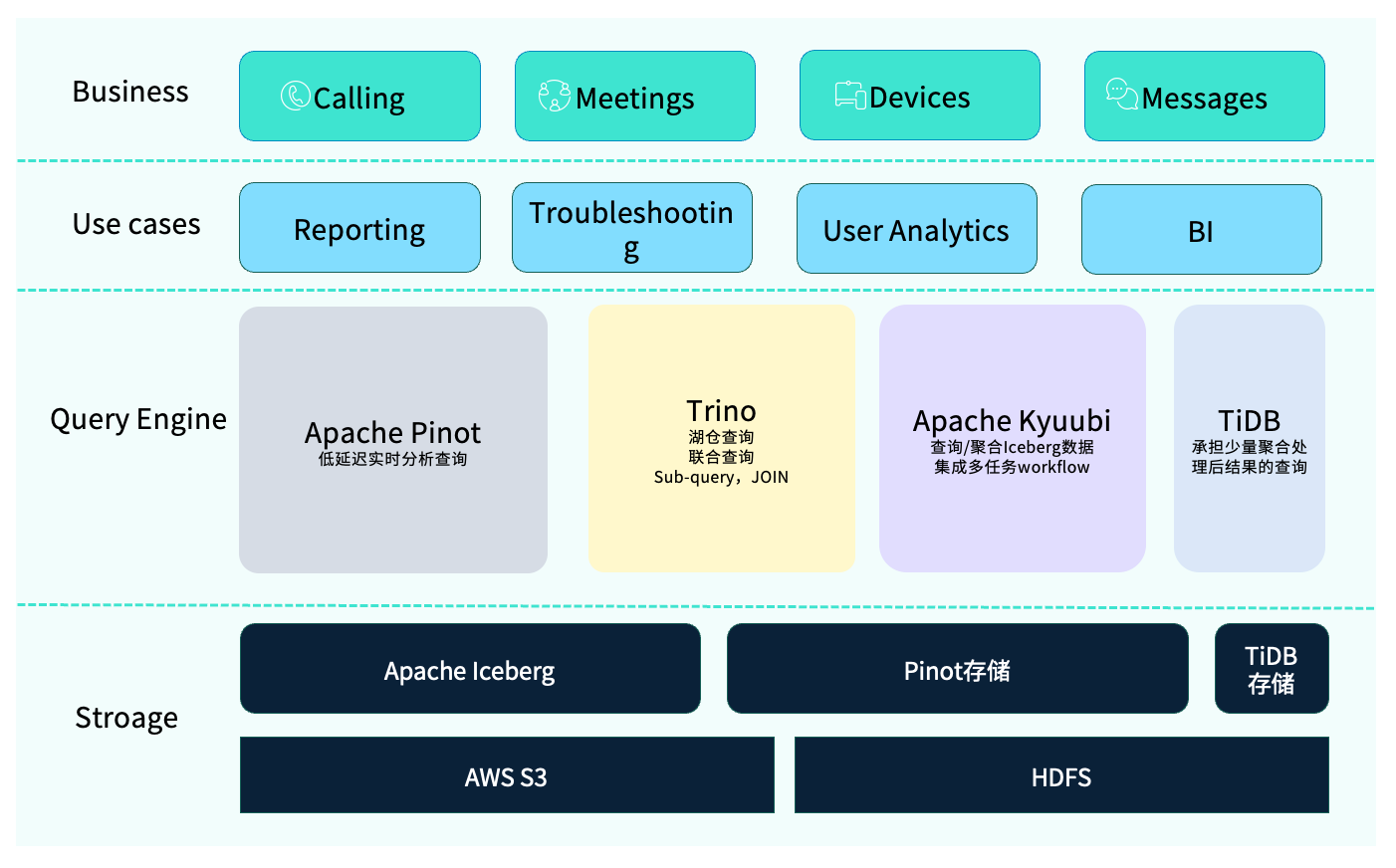 在存储层面,整体架构同样具备多元化特征。由于 Webex 的业务覆盖全球,不同区域的数据合规要求差异较大——例如欧盟地区对数据隐私与合规性要求更为严格,而北美地区部分组织则对敏感数据的管理有额外限制。因此,我们采用了混合存储方案:部分数据存放在 AWS S3,另一部分则保存在私有 HDFS 集群中,以满足不同地区的安全与合规标准。