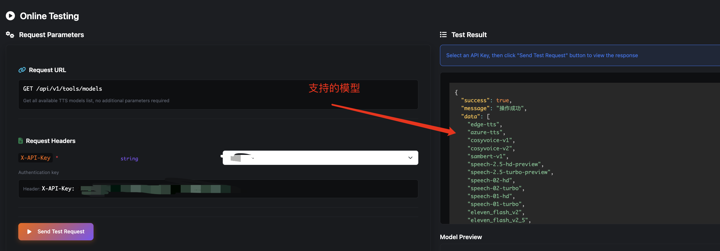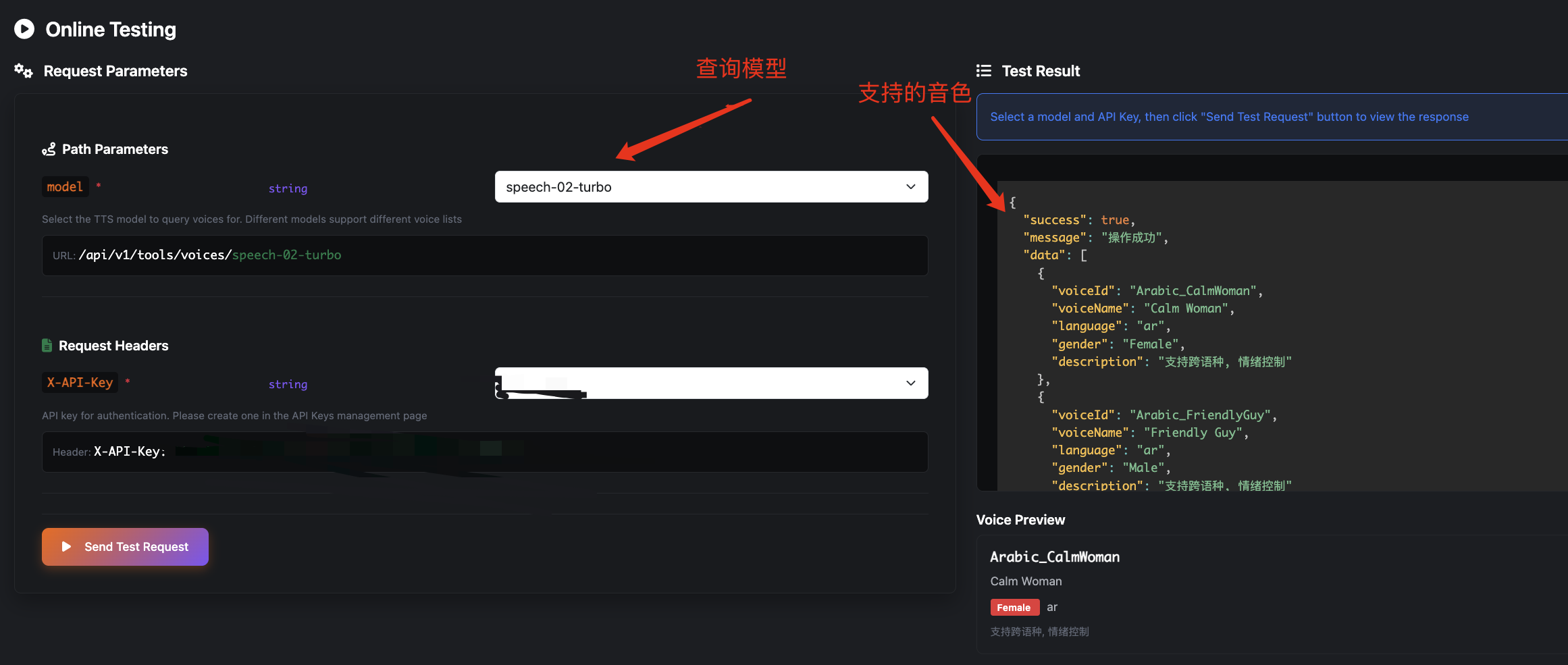 每个模型下支持的 voice,也可以调用接口查询,比如这里尝试调用 minimax 支持的 voice: