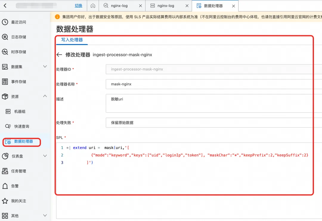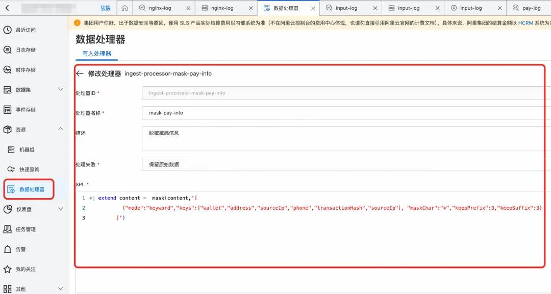 通过 IngestProcessor 里设置脱敏语句(也是使用 regexp_replace 正则表达式函数),脱敏处理在日志服务中完成,不占用端侧资源