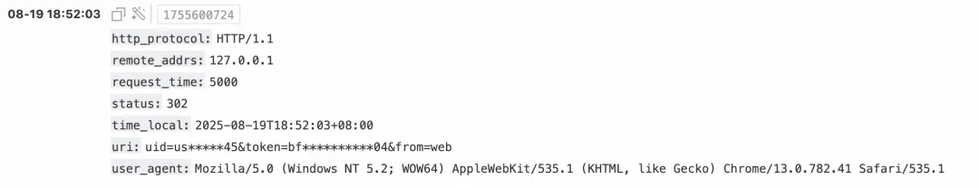 访问日志详细记录了用户的每一次访问行为,是故障排查、性能优化和安全审计的重要依据。然而,URI 参数中往往包含用户 ID、会话 Token、API 密钥等高度敏感信息,是数据泄露的高危区域。用户 ID、会话 Token 等参数往往直接暴露在 URL 中。mask 的 keyword 模式能精准识别 key=value