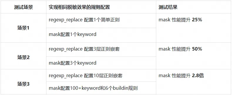 mask 脱敏函数相比正则方式具有更高的处理效率,特别适用于大数据量和复杂脱敏需求的场景。