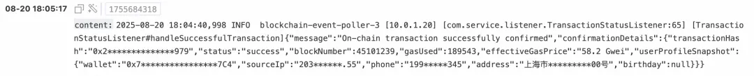 DeFi 平台每日处理数万笔链上交易,每笔交易都会生成包含用户钱包地址、交易哈希、用户画像等敏感信息的详细日志。为了满足数据保护法规要求,同时保证业务分析和故障排查的需要,需要对交易确认日志中的 钱包地址、地址信息、来源 IP、手机号、交易哈希等敏感字段进行脱敏,保留前后各 3 位字符以便业务追溯。