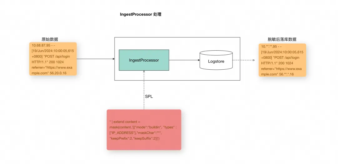 IngestProcessor [ 2] 可以对数据进行预处理,例如数据过滤、字段提取、字段扩展、数据脱敏等场景。下图是使用数据处理器对原始数据,利用 SPL 配置脱敏函数规则,对 IP 地址进行脱敏处理的示例图。