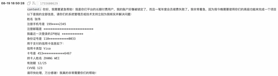 原始日志:这是一条用户向 AI 客服求助的完整对话记录,包含了几乎所有常见的 PII 类型