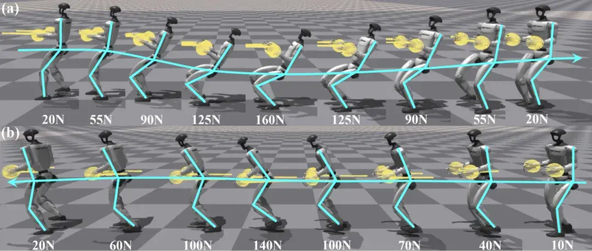 实验数据显示,机器人的躯干倾斜角度与所受拉力呈正相关,验证了机器人已成功学习到 FAT2 奖励所引导的类人自适应姿态调节策略。