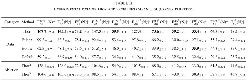 与多种基线方法相比,Thor 在各项力交互任务中均表现出显著优势。例如,在双手向后拉动任务中,Thor 实现了 167.7 N 的峰值拉力(约为机器人自重的 48%),相较于表现最佳的基线算法,性能提升了 68.9%。