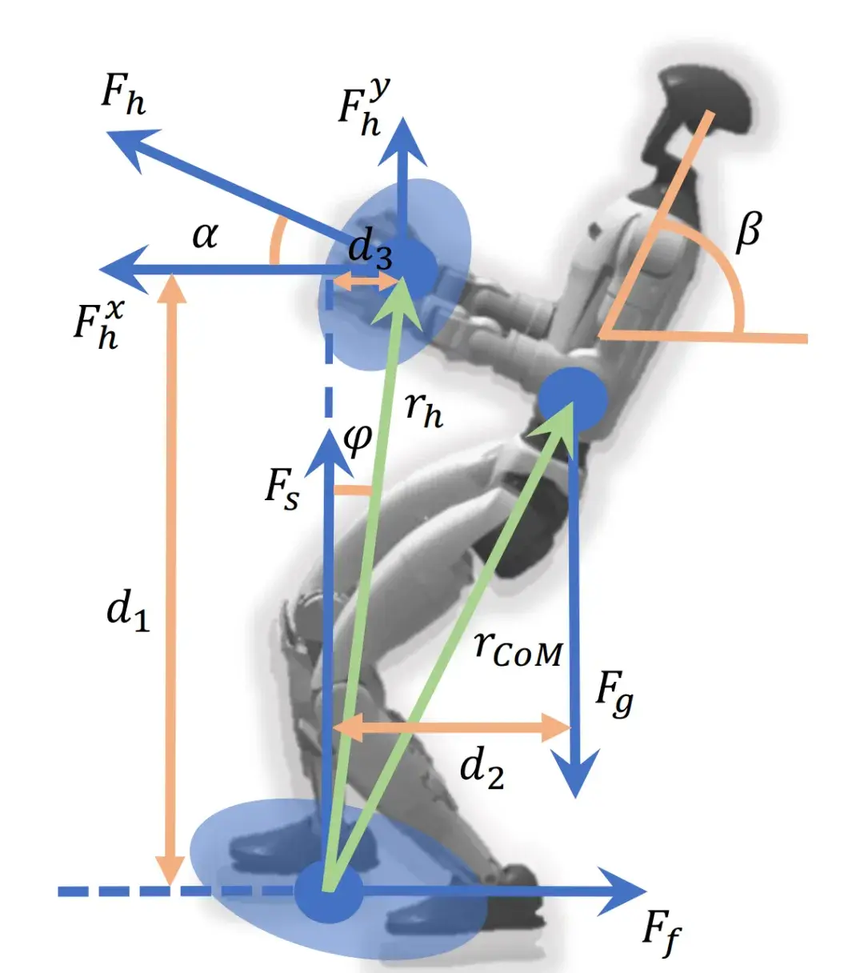 如下图所示,当机器人被建模为刚体并承受拉力时,它必须通过自适应地倾斜身体来调整质心位置,以满足上述平衡条件。这一原理正是我们奖励函数设计的核心,旨在引导机器人学习类人的姿态适应策略,以增强末端执行器的有效作用力,从而胜任高强度的力交互任务。