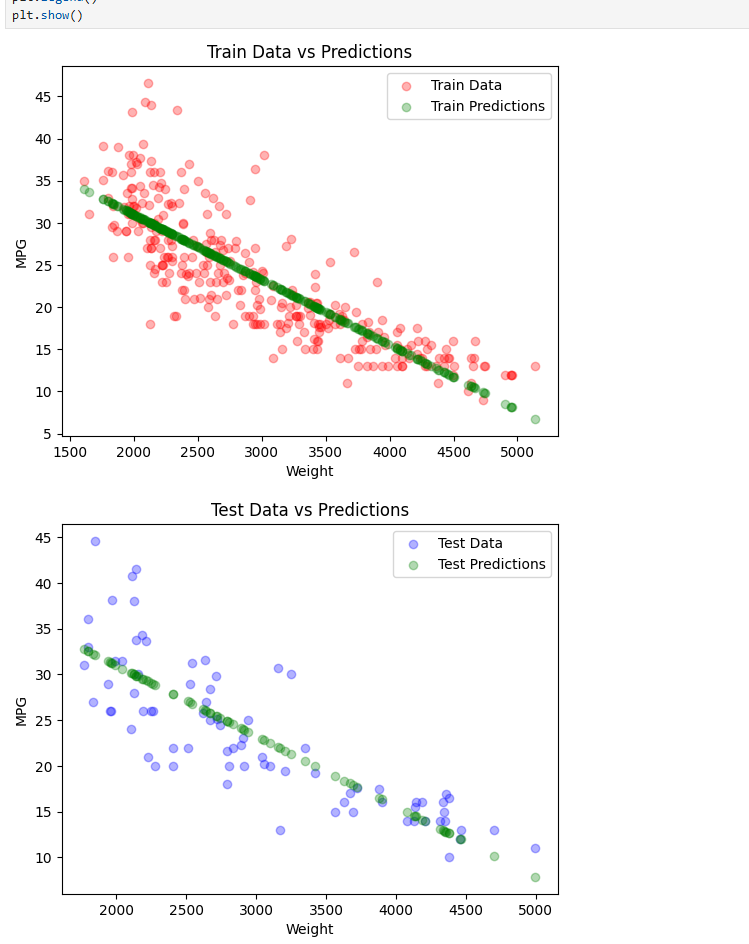 # 可视化结果plt.scatter(X_train, Y_train, color='red', alpha=0.3, label='Train Data')plt.scatter(X_train, lr.predict(X_train), color='green', alpha=0.3,label='Train Predictions')plt.xlabel('Weight')plt.ylabel('MPG')plt.title('Train Data vs Predictions')plt.legend()plt.show()plt.scatter(X_test, Y_test, color='blue', alpha=0.3, label='Test Data')plt.scatter(X_test, lr.predict(X_test), color='green', alpha=0.3, label='Test Predictions')plt.xlabel('Weight')plt.ylabel('MPG')plt.title('Test Data vs Predictions')plt.legend()plt.show()