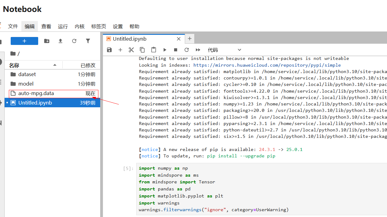 2. 数据加载与预处理数据准备:将如下链接数据集下载,并通过 notebook 上传。https://dtse-mirrors.obs.cn-north-4.myhuaweicloud.com/case/0038/auto-mpg.data