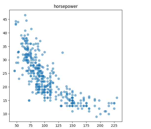 # 加载数据path = 'auto-mpg.data'columns = ["mpg", "cylinders", "displacement", "horsepower", "weight","acceleration", "model year", "origin", "car name"]cars = pd.read_csv(path, delim_whitespace=True, names=columns)# 数据预处理cars = cars[cars.horsepower != '?']cars['horsepower'] = cars['horsepower'].astype(float)