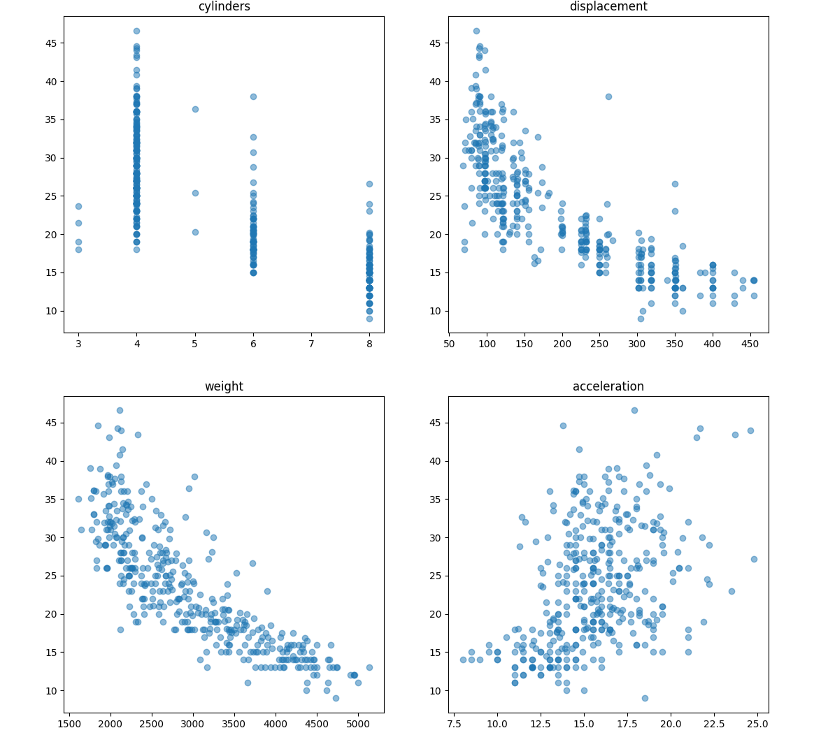这里使用 matplotlib 打造了一个可视化界面,展示了不同特性(气缸数、排量、重量、加速度、马力)与燃油效率(mpg)之间的关系。这一步有助于理解数据特性以及各特性与目标变量之间的关系。