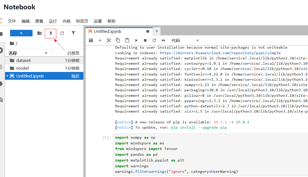 点击 Notebook 左上角上传按钮,选中下载的数据集,进行上传。