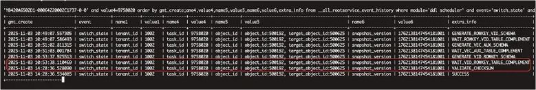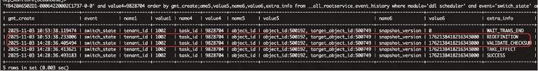 通过查询内部表 _allrootserviceeventhistory 的 WAITVIDRPWKEYTABLECOMPLEWEMT 状态下对应表的构建子任务的状态和耗时可以看出:耗时比较久的是 REDEFINITION 状态,耗时为 3.5 小时,基本接近上文 WAITVIDRPWKEYTABLECOMPLEWEMT 状态的耗时,也就是说 WAITVIDRPWKEYTABLECOMPLEWEMT 状态的耗时点在 REDEFINITION 状态。
