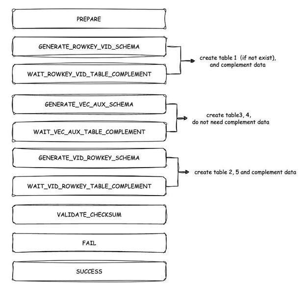 第一步,创建 1 号表 rowkey_vid table。如果该表已存在,可直接跳过,如果不存在,会直接创建 1 号表的 Schema、再在表中补全数据,该状态结束后会进入到下一个状态。