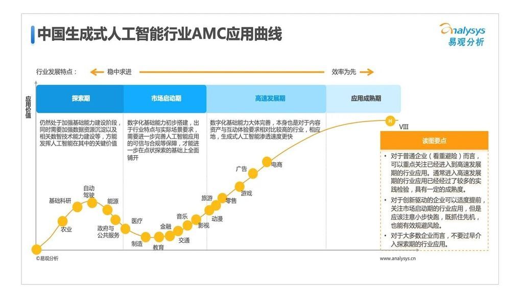 截至 2025 年 6 月,我国生成式人工智能用户规模达 5.15 亿人。从用户的应用场景来看,主要应用场景包括回答问题、日常办公、休闲娱乐、创作内容等。其中,利用生成式 AI 回答问题的用户最为广泛,达 80%以上。通过易观分析的 AMC 曲线,可以看到广告营销是生成式 AI 的高速发展市场。