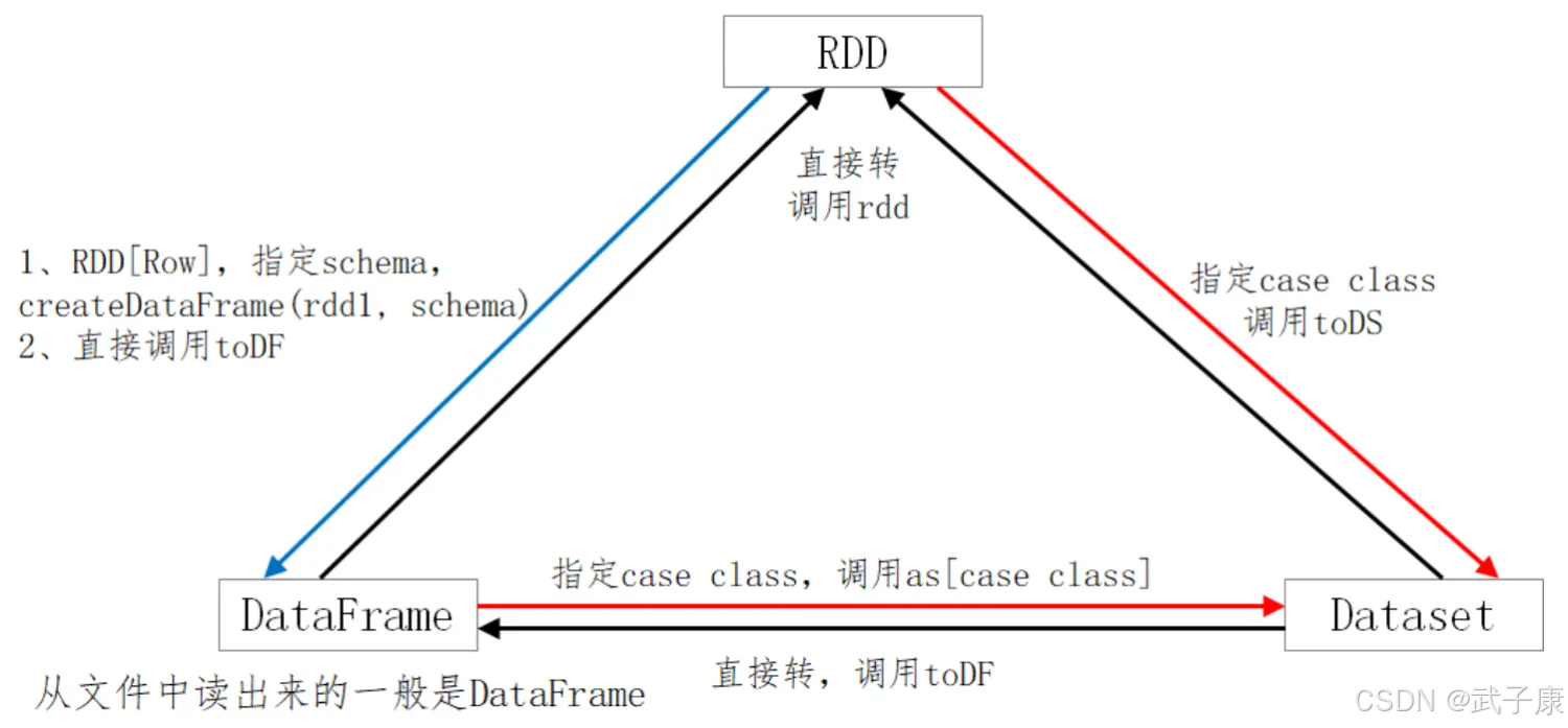 DataFrame 转换为 RDD:使用 rdd 方法,转换后元素类型为 Row。