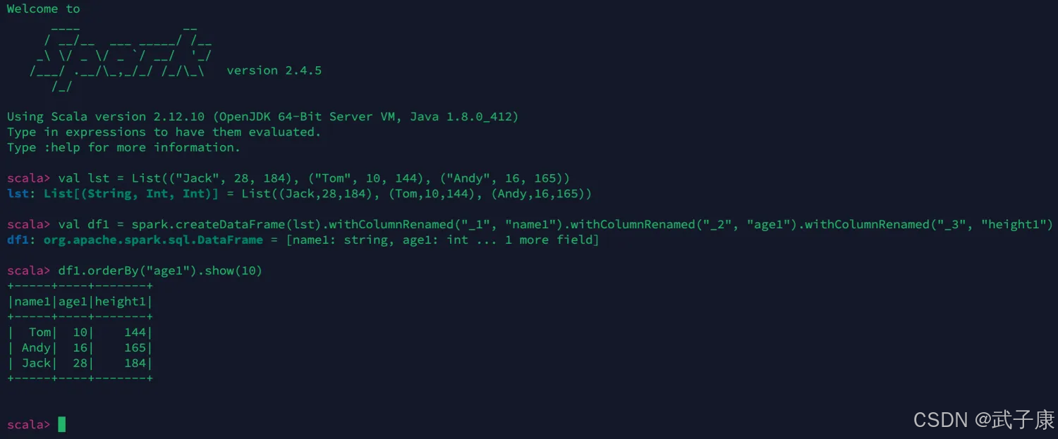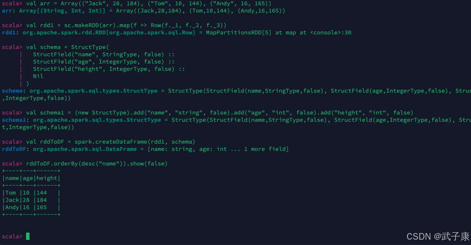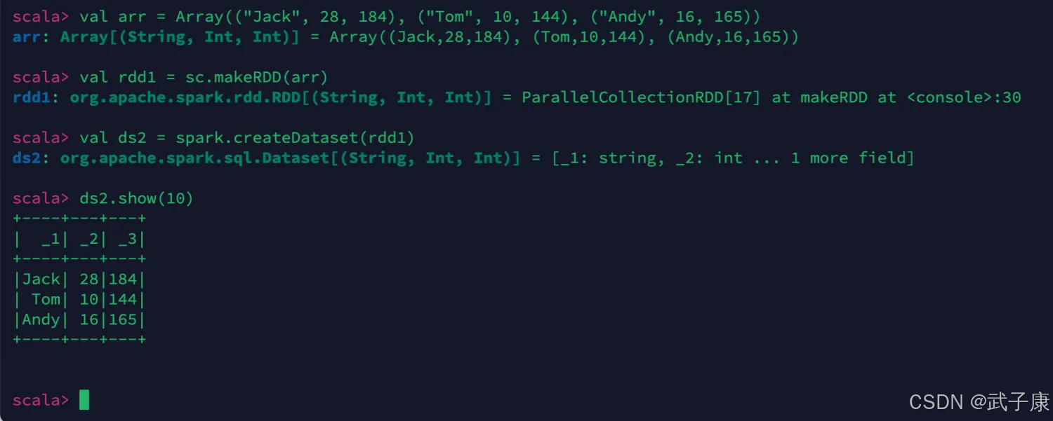 使用隐式转换:需要导入 spark.implicits._,这允许你在不显式提供模式的情况下将常见的 RDD(如元组)转换为 DataFrame。