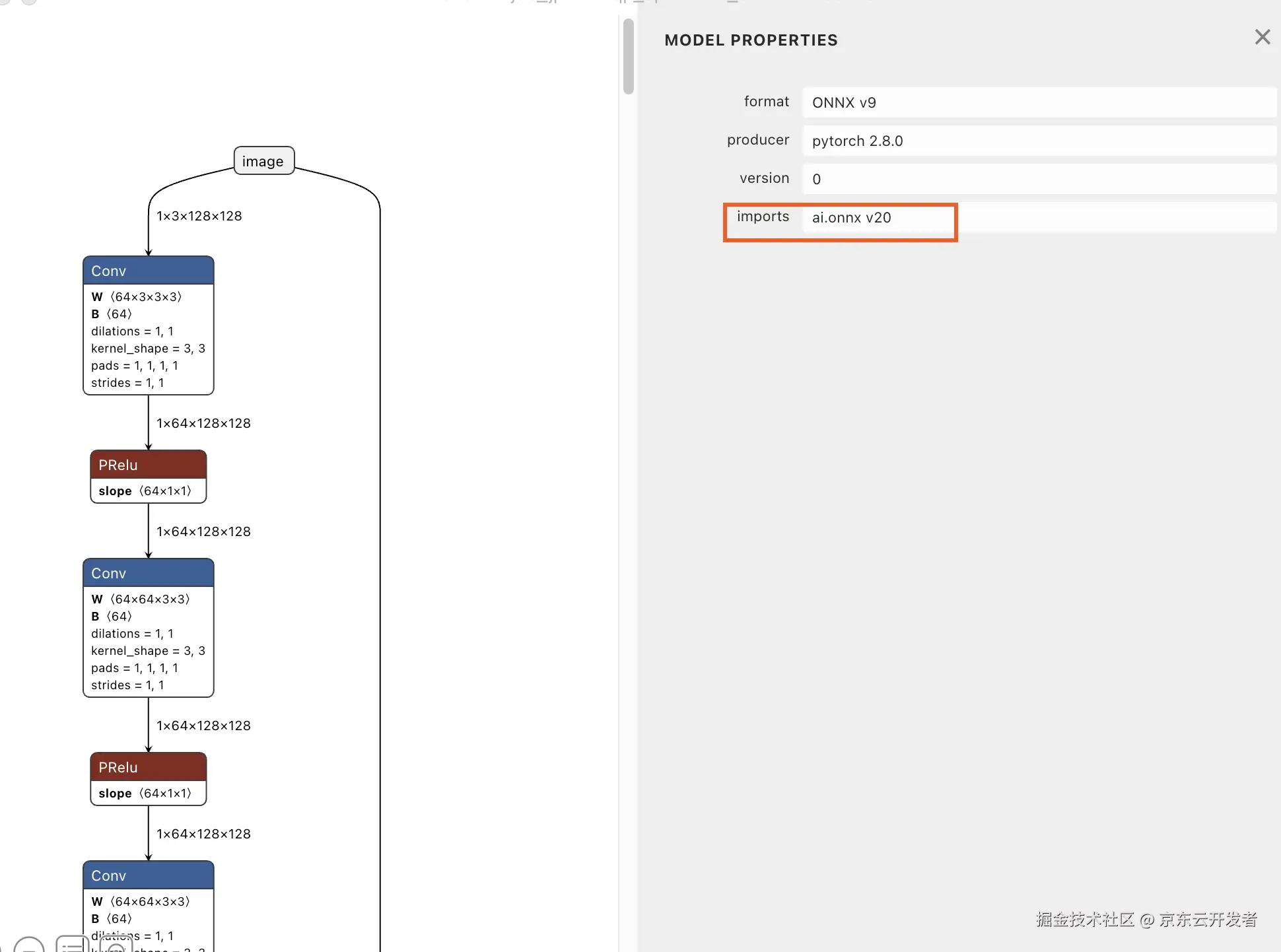 当前使用 CANN 进行模型转换, 支持 ONNX opset 版本 7~18(最高支持到 V1.13.1), 首先需要查看原始的 onnx 模型的 opset 版本是否在支持范围, 这里我们使用Netron(点击下载)可视化工具进行查看。