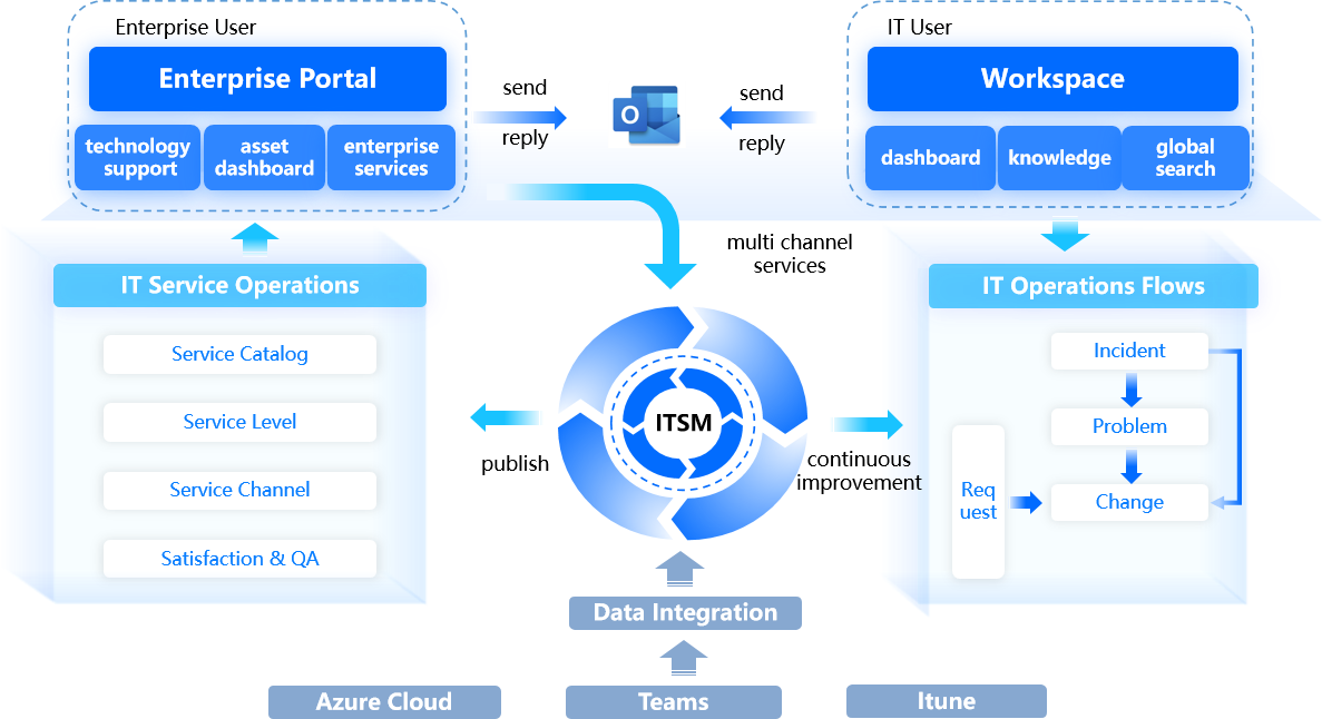 7. 多渠道协同:打通邮件渠道,支持邮件建单、审批、双向沟通及工单状态自动同步,集成 Teams Chatbot、企业门户等多服务渠道,实现全场景便捷触达。