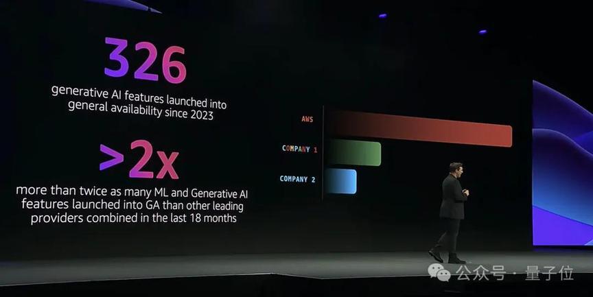 根据 Matt Wood 所公布的数据显示,在过去 18 个月里,亚马逊云科技在生成式 AI 发布的功能数量,是第二、第三名加起来的 2 倍还要多。