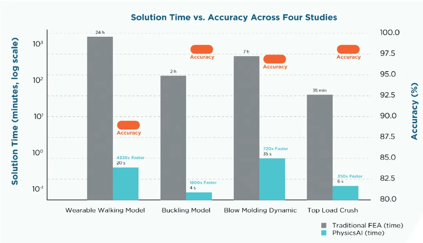 运行于标准 CPU 的 PhysicsAI 模型,其速度比传统有限元分析快 350 倍至 4000 倍,同时准确率保持在 87.5% 至 97.5% 之间;