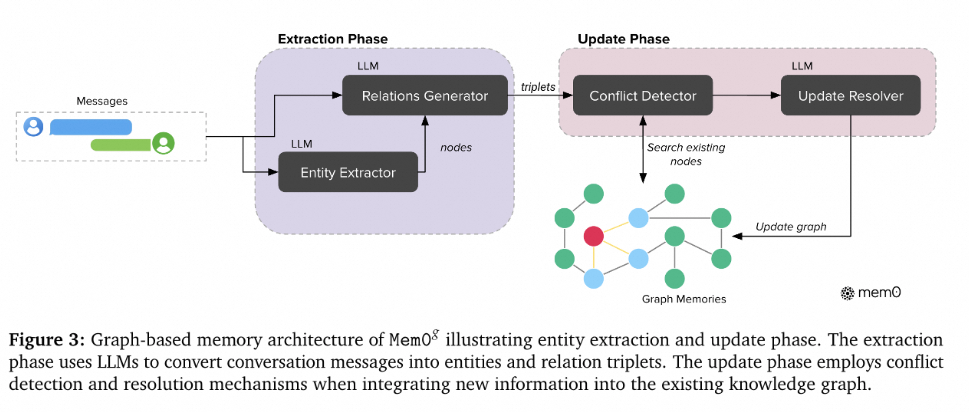 记忆更新:对于每一个新的关系三元组,我们计算源实体和目标实体的 Embedding,然后搜索语义相似度高于设定阈值的现有节点。为了保持知识图的一致性,实现了一个冲突检测机制 ,用于在新信息到来时识别潜在的冲突关系。基于 LLM 的更新解析器会判断某些关系是否应被废弃,并将其标记为无效,而非物理删除,从而支持时间推理。(这个机制有点类似于 ZEP)