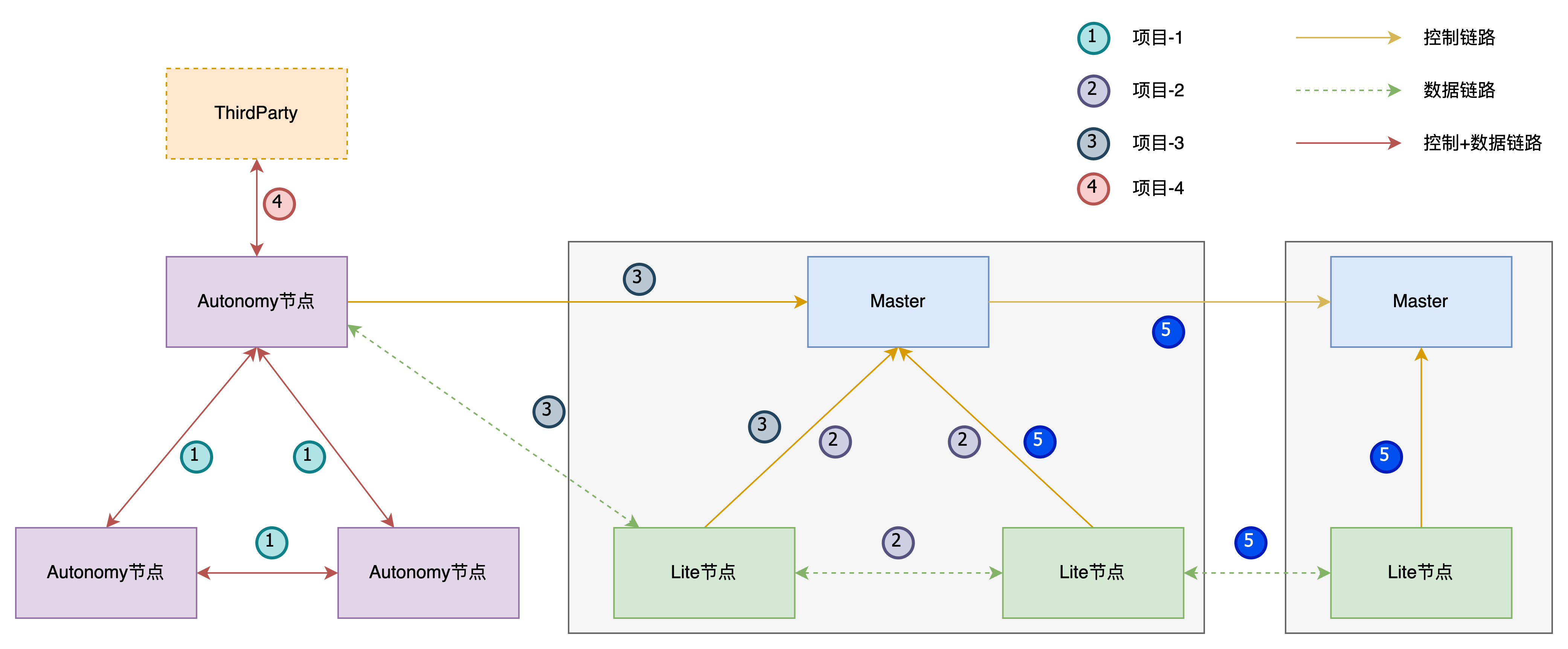 一般来讲,控制平面和节点之间,1:N 组成了中心化网络,1:1 组成了点对点(P2P)网络。中心化网络中的节点称为 Lite 节点,点对点网络中的节点称为 Autonomy 节点。