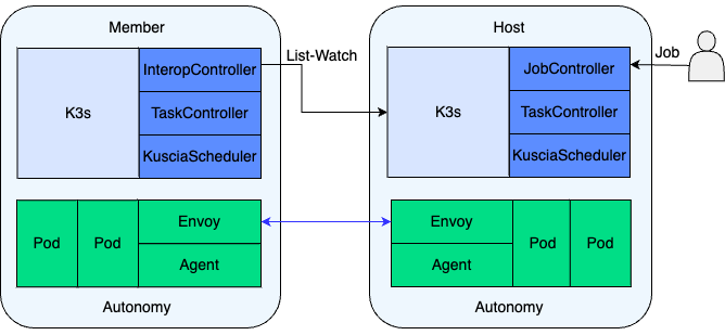 在 Kuscia 编排框架中,作业(Job)编排和任务(Task)调度主要通过 Job Controller、Task Controller、InterConn Controller、Kuscia Scheduler 协同完成。