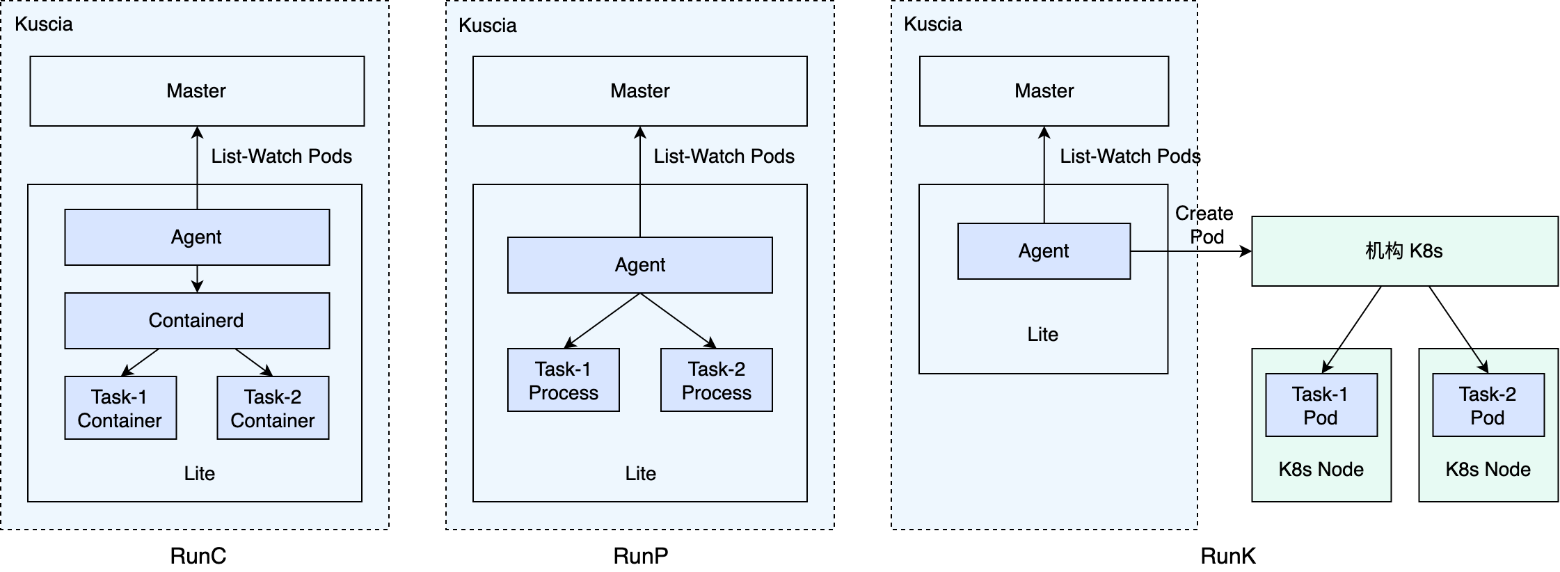 RunP:即进程运行时,直接在 Agent 容器内以进程形式拉起任务 Pod。