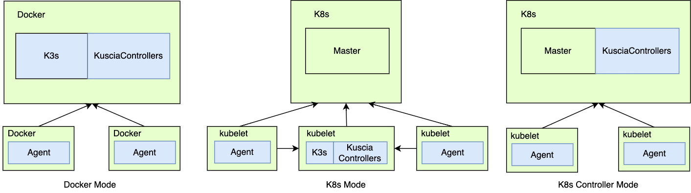 Kuscia 提供三种部署模式:Docker 模式、K8s 模式、K8s 控制器模式,以适配不同机构的基础设施。