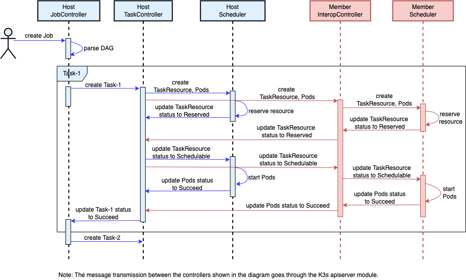 任务参与方的 InterConn Controller 从调度方集群中将本方的 TaskResource 和 PodGroup 同步到参与方集群中。参与方集群中的 TaskResource 和 PodGroup 的状态也会通过