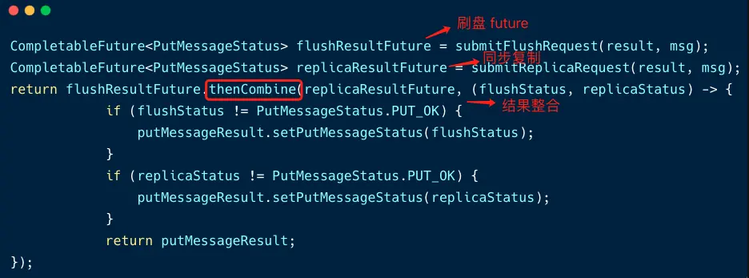 当 commitLog 执行完 appendMessage 后, 需要执行刷盘任务和同步复制两个任务,这里用到了 CompletableFuture 这个异步神器。 当 HAConnection 读服务接收到 Slave 的进度反馈,发现消息数据复制成功,则唤醒 future 。最后 Broker 组装响应命令 ,并将响应命令 返回给客户端 。