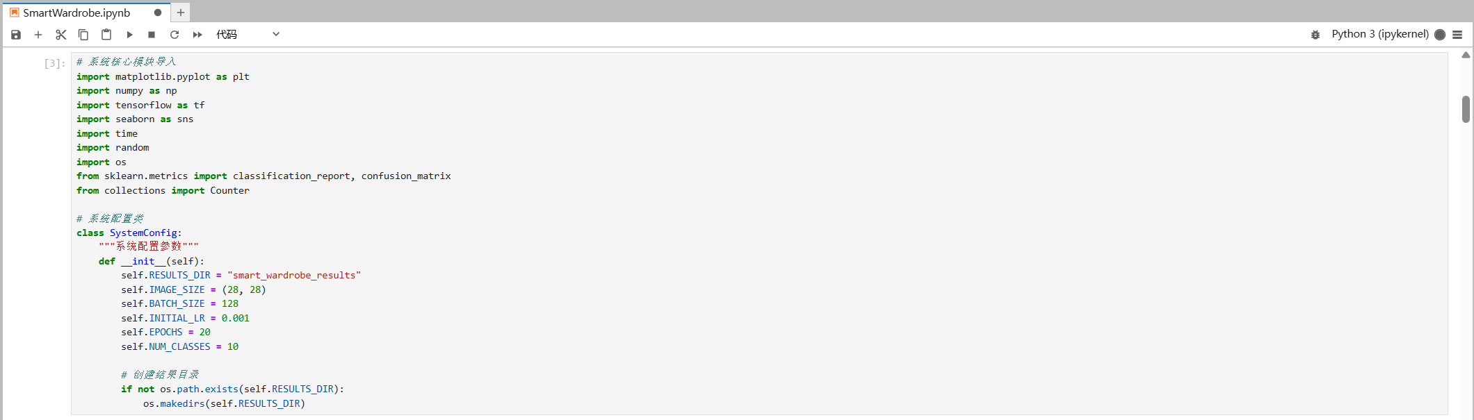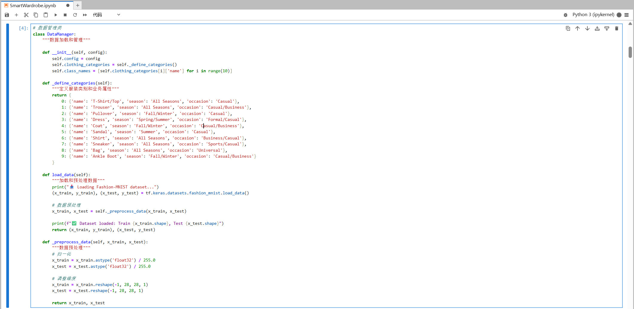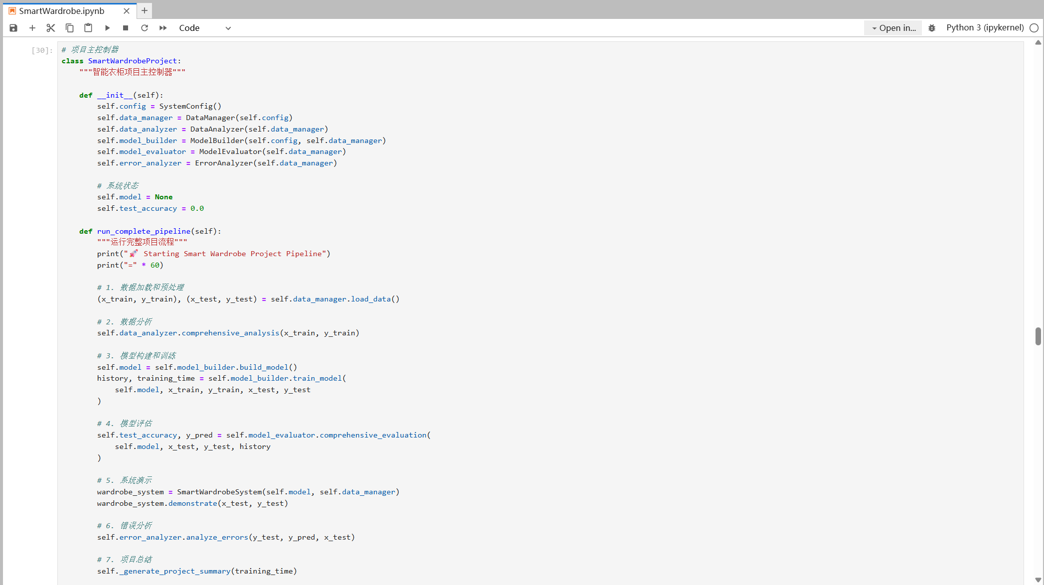 SmartWardrobeProject ├── SmartWardrobeProject # 项目主控制器,系统入口 ├── SystemConfig # 统一管理系统配置参数,结果目录管理 ├── DataManager # 数据加载和预处理,服装类别定义 ├── DataAnalyzer # 数据探索和可视化,业务洞察生成 ├── ModelBuilder # CNN模型构建,训练流程管理 ├── ModelEvaluator # 性能评估和分析,可视化报告生成 ├── SmartWardrobeSystem # 实时预测功能,系统演示界面 ├── ErrorAnalyzer # 错误模式识别