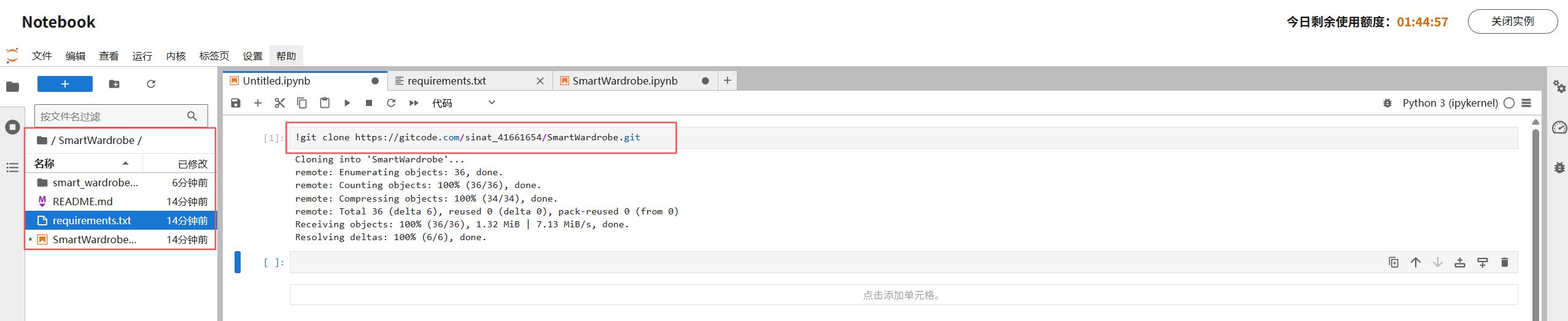 在SmartWardrobe目录下打开SmartWardrobe.ipynb文件,执行第一个 cell 下的命令,安装依赖包: