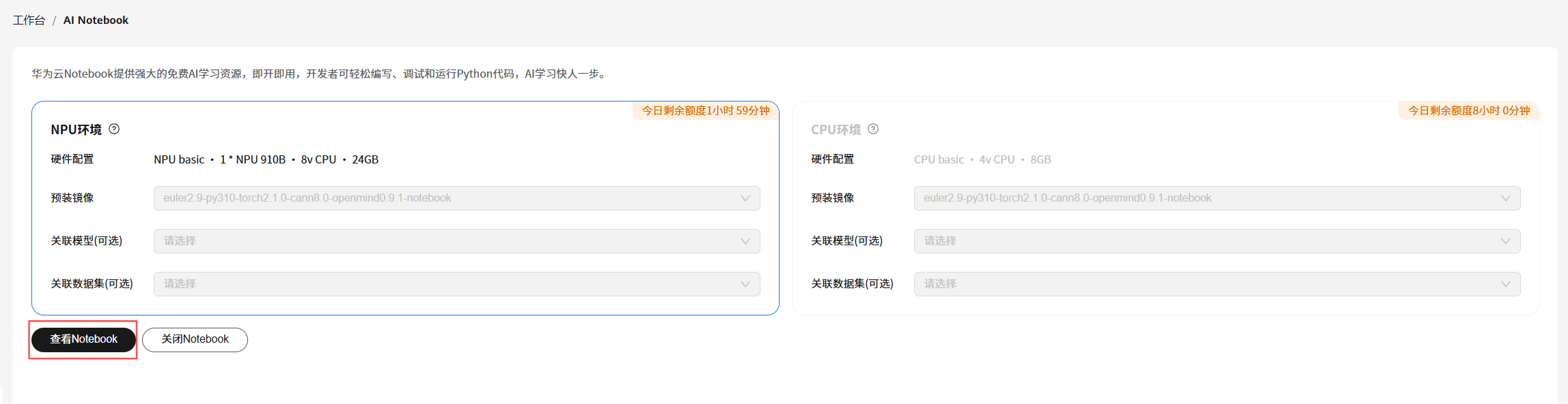 面向广大 AI 开发者群体,华为开发者空间提供免费昇腾NPU资源的Notebook,方便开发者学习昇腾相关的专业知识以及配套实验。
