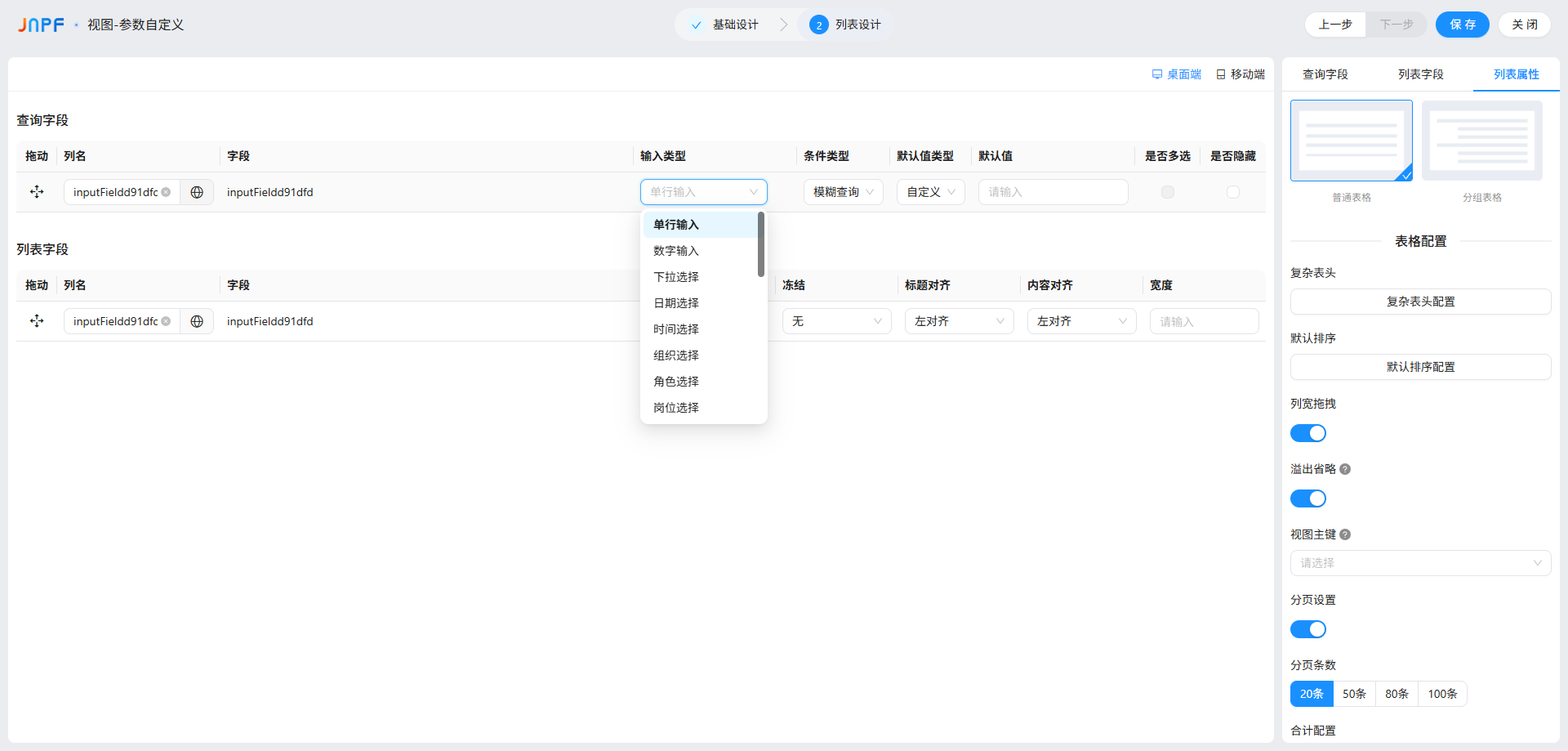 查询字段的核心配置是 “输入类型、条件类型、默认值类型”,不同配置组合对应不同筛选效果,按场景拆解如下: